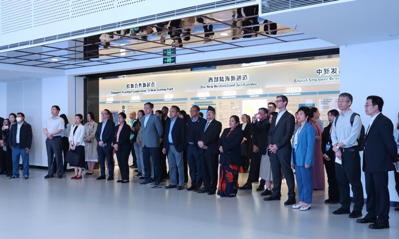 在中新物流園,使節(jié)團(tuán)通過參觀展廳、聽取介紹、互動(dòng)交流等方式詳細(xì)了解園區(qū)的發(fā)展情況,對西部陸海新通道的戰(zhàn)略地位與廣西在其中的作用有了更深的認(rèn)識(shí)。中新物流園是廣西參與“一帶一路”及推進(jìn)中國與新加坡互聯(lián)互通、西部陸海新通道建設(shè)、海洋經(jīng)濟(jì)發(fā)展的重大項(xiàng)目之一,自2018年10月開工建設(shè)以來,園區(qū)發(fā)展迅猛,產(chǎn)業(yè)集聚效應(yīng)加速顯現(xiàn),現(xiàn)已引進(jìn)超30家世界500強(qiáng)和中國100強(qiáng)龍頭企業(yè)進(jìn)行合作,共同實(shí)施項(xiàng)目建設(shè)與運(yùn)營。