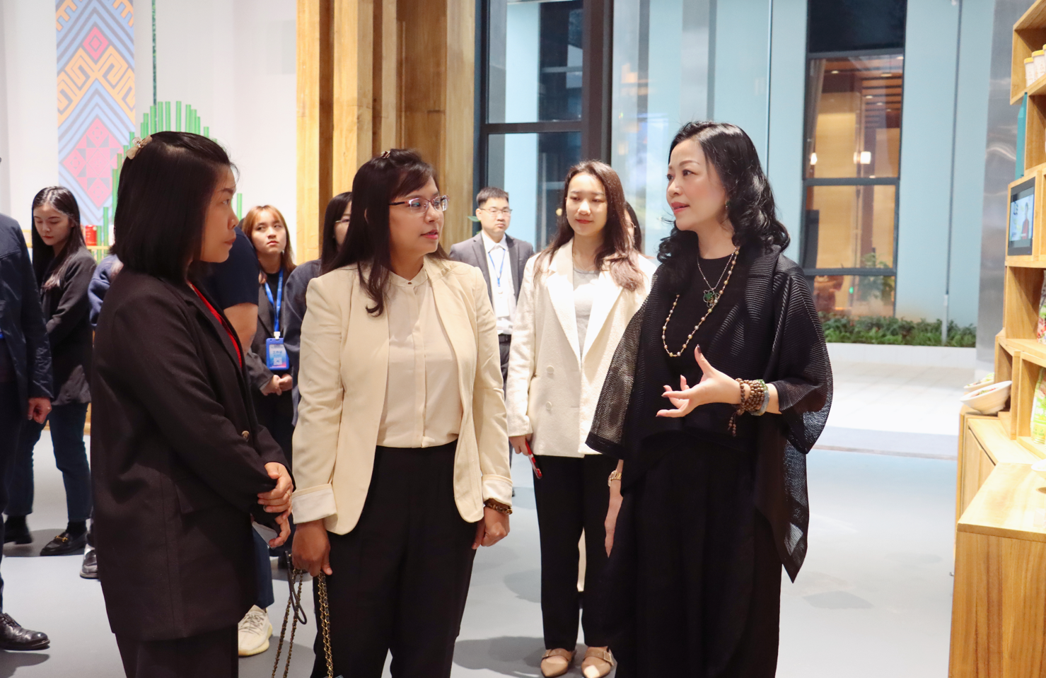 在參觀匯聚中心17個國家及地方特色展館過程中,趙海燕董事長介紹了匯聚中心展館如何通過人文設(shè)計理念烘托出各國當(dāng)?shù)靥厣a(chǎn)品,以沉浸式的獨特商品貿(mào)易體驗促進(jìn)交易。作為匯聚中心精心打造的國家主題展館,緬甸館以該國傳統(tǒng)特色文化為基調(diào),巧妙融合本地風(fēng)土人情元素打造的“金色緬甸”效果,贏得了高凱玨參贊的認(rèn)可。她表示緬甸館不僅設(shè)計別出心裁,而且能夠在一定的空間里盡可能地將緬甸多元文化與特色產(chǎn)品展示出來,可見項目策劃人所費的心思不一般。