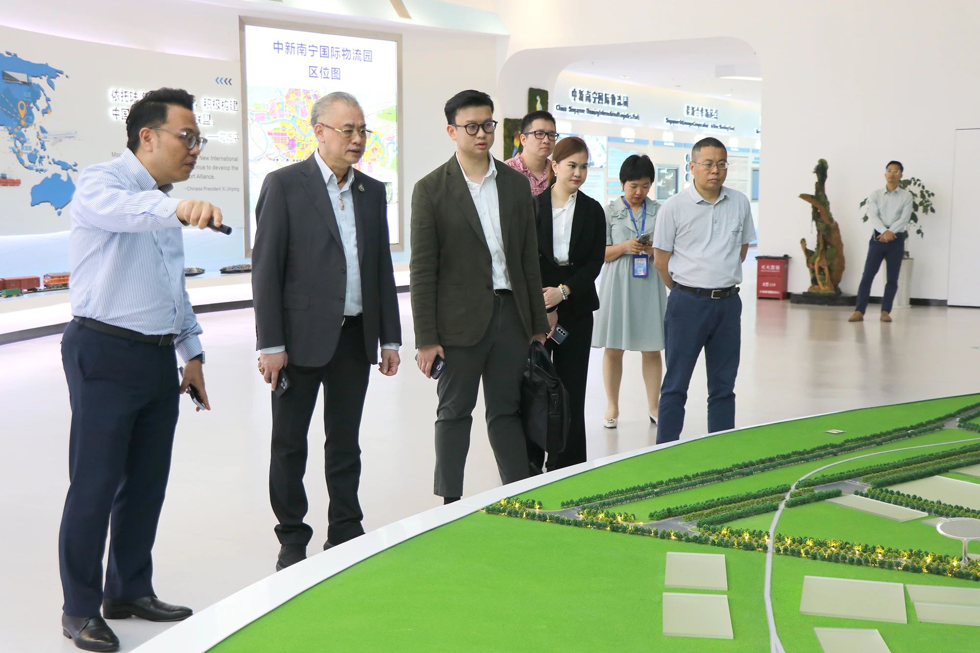 在中新物流園展示中心,考察團一行深入了解項目的整體情況。作為國際陸海貿(mào)易新通道上重要的物流樞紐節(jié)點項目之一,園區(qū)堅持以“強中選強,優(yōu)中選優(yōu)”重點引進大型物流龍頭企業(yè)為招商理念和工作方針,目前已引進超30家世界500強和中國100強龍頭企業(yè)進行合作,共同實施項目建設(shè)和運營。同時,為能更好地搶抓RCEP新發(fā)展機遇,中新物流園與時俱進不斷創(chuàng)新,于2021年聯(lián)合中國—東盟博覽會秘書處共同打造了獨具特色的匯聚中心,通過線上數(shù)字化平臺+線下展館沉浸式商貿(mào)體驗相結(jié)合的方式,致力于搭建一個中國與東盟、RCEP其他區(qū)域國家乃至“一帶一路”沿線重要國家線上線下經(jīng)貿(mào)往來的一站式首選平臺。