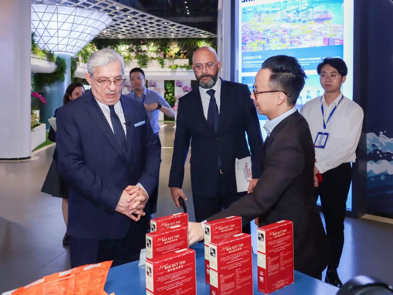 在參觀過(guò)程中,借鑒新加坡克拉碼頭建筑風(fēng)格的中庭吸引了考察團(tuán)的目光,在得知匯聚中心不僅促進(jìn)以東盟國(guó)家為主的RCEP區(qū)域國(guó)家和“一帶一路”沿線重要國(guó)家的經(jīng)貿(mào)往來(lái),也通過(guò)不定期舉辦大型的主題活動(dòng)增進(jìn)各國(guó)人文往來(lái)之后,對(duì)項(xiàng)目創(chuàng)新理念有了更充分的了解。目前,匯聚中心根據(jù)不同國(guó)家的文化特色已經(jīng)舉辦了包括廣西新絲路跨年電商節(jié)晚會(huì)、中國(guó)東盟人文交流——潑水節(jié)慶?;顒?dòng)在內(nèi)的近百場(chǎng)主題活動(dòng)。穆薩大使叮囑同行人員要充分利用匯聚中心的平臺(tái)優(yōu)勢(shì),積極著手在匯聚中心開(kāi)展土耳其經(jīng)貿(mào)推介、清真文化、特色美食等主題活動(dòng),增進(jìn)兩國(guó)的經(jīng)貿(mào)和人文往來(lái)。
