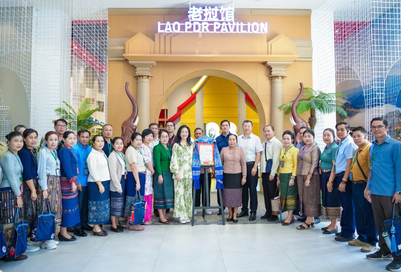 來到老撾館,考察團(tuán)立即被醒目的、象征中老友誼的“中老鐵路”所吸引。入口處兩尊工藝精湛、栩栩如生的大象木雕,以及仿照老撾凱旋門廣場(chǎng)精心設(shè)計(jì)的門頭造型,都令考察團(tuán)成員仿佛置身老撾。當(dāng)?shù)弥蠐氲钠【?、茶葉等特色商品通過匯聚中心線上線下平臺(tái)受到了越來越多的消費(fèi)者青睞時(shí),希帕占·南塔馮薩副主席深表感謝,也非常感動(dòng)在中國還有如此創(chuàng)意且專為老撾商家進(jìn)行商品展銷的展館,為老撾商家創(chuàng)造了無限商機(jī),讓更多的人通過匯聚中心知道老撾、了解老撾進(jìn)而走進(jìn)老撾,也成為促進(jìn)中老雙邊經(jīng)貿(mào)往來的重要窗口!
